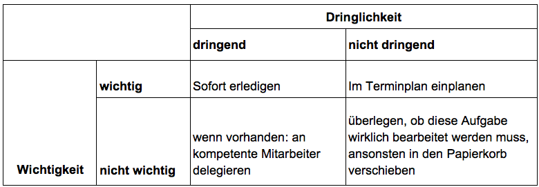 Eine weitere Möglichkeit Aufgaben einzuteilen und zu priorisieren ist die sogenannte Eisenhower-Matrix. Hierbei werden To-Dos in Kategorien eingeteilt. Dadurch sieht man sofort, welche Aufgaben schneller zu erledigen sind als andere. Es gibt zwei Hauptkategorien, nämlich die Dringlichkeit und die Wichtigkeit, die sich nochmals in zwei Unterkategorien einteilen (dringend und nicht dringend, wichtig und nicht wichtig).
