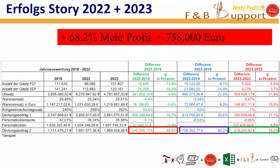 Es macht sehr viel Sinn, sich regelmäßig mit den Zahlen des Betriebes aus der BWA und im Controlling zu befassen, mit der Kalkulation und Preisstrategie, die Renner – Gewinner Auswertungen, Budgets und Ziele, Gastro-BWL zu erlernen, die Mitarbeitereinsatzplanung mit Umsatzprognose und Deckungsbeitrag 2 durchzuführen, Getränkepauschalen und All-Inklusiv-Feiern umzusetzen, die 7 wichtigsten Kennzahlen täglich zu kontrollieren, den Fokus und die gesamte Energie auf Maßnahmen für mehr Marge – Deckungsbeitrag – Profit Verbesserung richtet, dann und nur dann, funktioniert es auch bei Euch mit einem sehr guten Betriebsergebnis wie in diesem Erfolgs-Umsetzungs-Beispiel dargestellt.