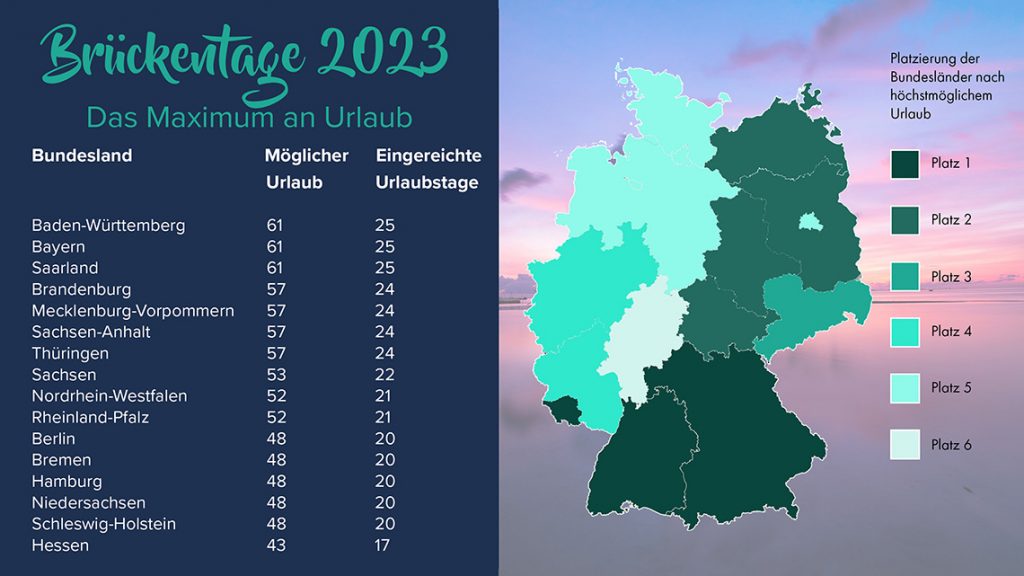 Ohne diese beiden kommt Bayern auf 12 Feiertage, genau wie Baden-Württemberg, Brandenburg und das Saarland. Abgesehen von Brandenburg gehören die anderen drei auch 2023 wieder zu den Spitzenreitern: Für 25 Urlaubstage gibt es 61 Tage frei. Hier kann der Urlaub also mehr als verdoppelt werden.