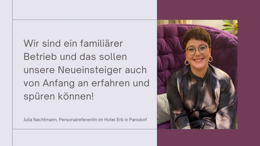 Julia Nachtmann, Personalreferentin im Hotel Erb in Parsdorf, hat die neue Reise der Talente mit ins Unternehmen gebracht. „Wir sind ein familiärer Betrieb und das sollen unsere Neueinsteiger auch von Anfang an erfahren und spüren können“, sagt Nachtmann. „Hier läuft einiges anders als in so manch großer Hotelkette. Mitarbeitende sollen bei uns ihren – nennen wir es Arbeits-Raum, nicht Platz, denn das klingt zu festgeschrieben – aktiv mitgestalten, selbst mitentwickeln. Das ist etwas, was man auch lernen kann und muss, je nachdem, welchen Background jemand mitbringt.“ Freiraum zur Entwicklung heißt im Hotel Erb in Parsdorf jedoch nicht, dass jeder machen kann, was er will. Ab dem Einstieg in den Onboarding-Prozess sind alle Stationen und Prozesse sehr genau definiert. „Nur wenn alle wissen, was sie tun, und wissen, wo sie stehen, können sie auch sehen und entdecken, wie und wohin sie weiter gehen wollen“, so Nachtmann.