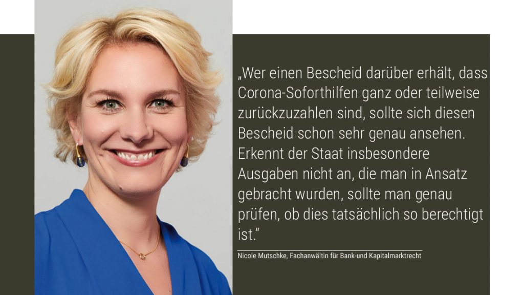Nicole Mutschke: Wer einen Bescheid darüber erhält, dass Corona-Soforthilfen ganz oder teilweise zurückzuzahlen sind, sollte sich diesen Bescheid schon sehr genau ansehen. Erkennt der Staat insbesondere Ausgaben nicht an, die man in Ansatz gebracht wurden, sollte man genau prüfen oder prüfen lassen, ob dies tatsächlich so berechtigt ist. Da die Informationen der einzelnen Bundesländer zur Corona-Soforthilfe zum Teil so dürftig und teilweise auch widersprüchlich waren und sich im Laufe der Zeit die Anforderungen auch mal geändert haben, sollte man sich in dann nicht gut überlegen, ob man nicht gegen einen Rückforderungsbescheid vorgeht.
