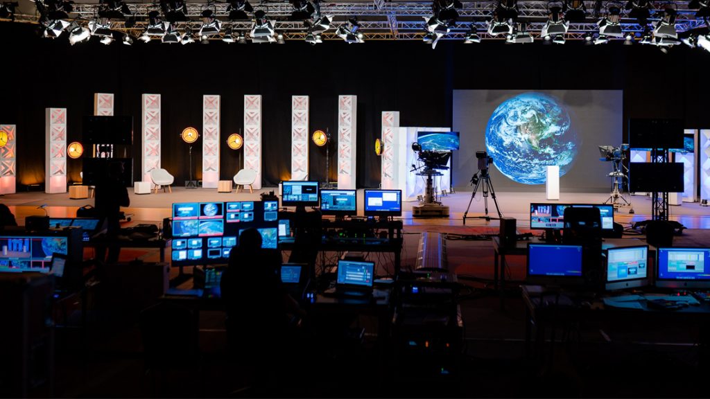 Dafür stehen drei Full-HD-Kamerazüge inklusive Video- und Tonregie, eine hochauflösende LED-Wand sowie Displays und variabel 3D-Designelemente, eine Studio- und Effektbeleuchtung sowie ein autarkes VLAN mit bis zu 500 Mbit/s bereit.