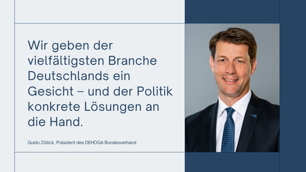 DEHOGA-Präsident Guido Zöllick fordert eine konsequente Neuausrichtung der Politik: „Ein Weiter so darf es nicht geben. Wir brauchen dringend eine Politik, die die Wirtschaft stärkt und dafür sorgt, dass sich Arbeit wieder lohnt. Unsere Familienbetriebe sind standorttreu. Wir verlagern keine Arbeitsplätze ins Ausland, sondern sichern und schaffen diese hier in Deutschland. Wir erwarten Wertschätzung und konkrete Antworten auf unsere Fragen.“