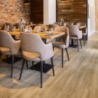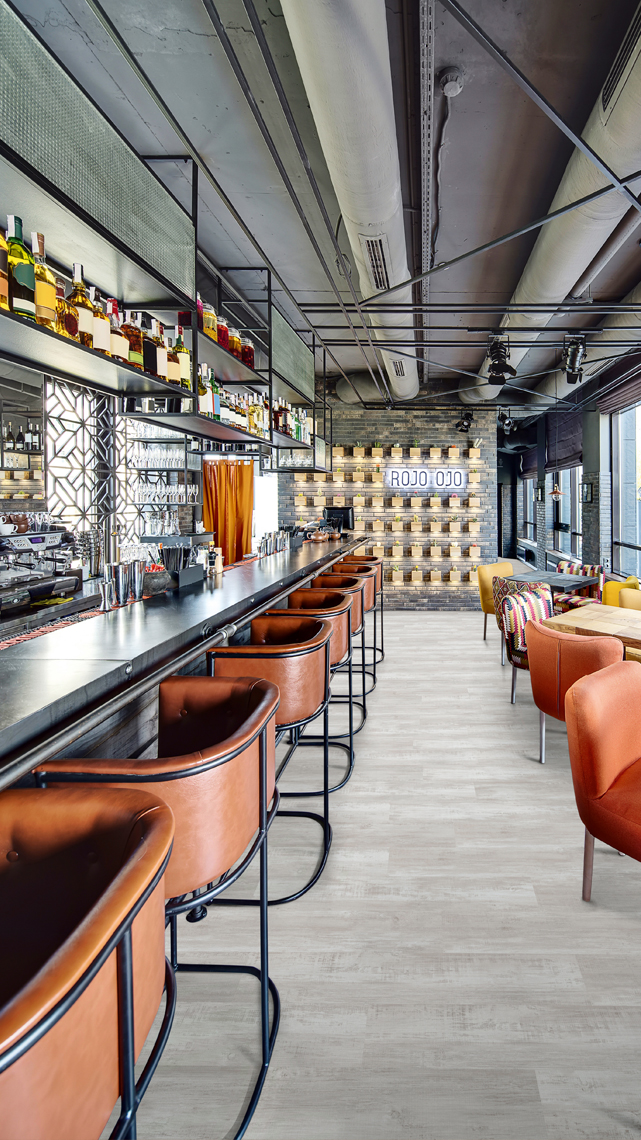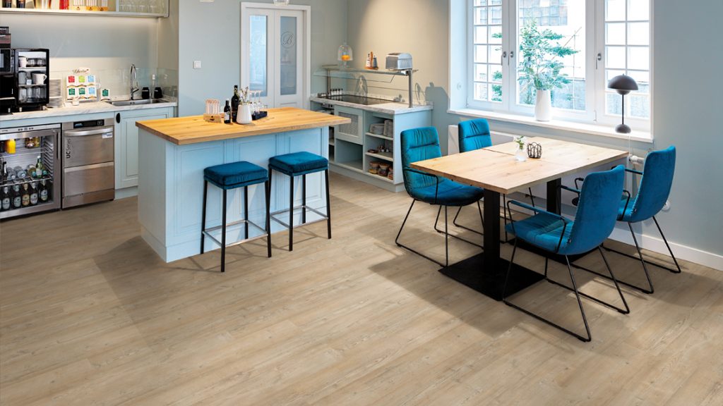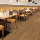 PROJECT FLOORS bietet so eine noch breitere Palette identischer Dekore für unterschiedliche Anforderungen, wodurch einfacher ganzheitliche Raumkonzepte umgesetzt werden können. Die völlig neue Materialzusammensetzung mit einem erhöhten Kunststoffanteil anstelle des bei Rigid Core Belägen sonst üblichen Füllmaterials verleiht dem Boden deutlich mehr Flexibilität.