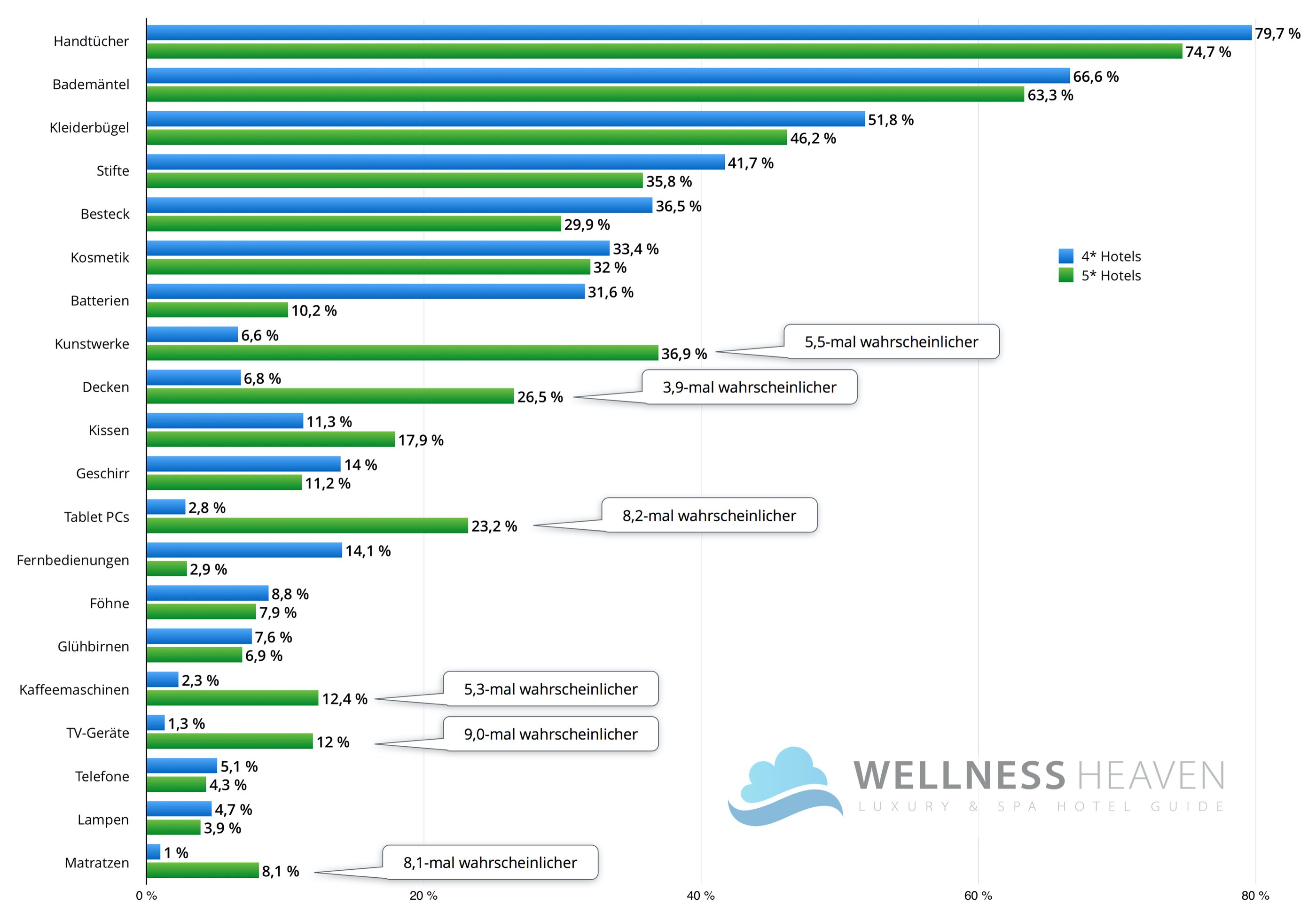 So ist etwa die Wahrscheinlichkeit, dass hochwertige TV-Geräte aus dem Zimmer geklaut werden, bei Gästen im 5-Sterne-Segment 9-fach höher als bei Reisenden in 4-Sterne-Hotels. Ebenso sind Kunstwerke in Luxushotels ein begehrtes Objekt der Begierde (5,5-mal höhere Diebstahl-Wahrscheinlichkeit). Auch Tablet PCs und Matratzen werden in 5-Sterne-Häusern häufiger entwendet.