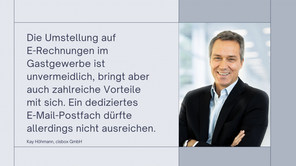 Als E-Rechnungs-Experte bei der cisbox GmbH aus Solingen und mit jahrelanger Branchenerfahrung bei der Digitalisierung von Rechnungseingangs- und Verarbeitungsprozessen in der Hotellerie und Gastronomie, weiß Kay Höhmann, was Hoteliers und Gastronomen über die bevorstehende Umstellung wissen müssen. Dazu gibt er handfeste Tipps, wie man sich und den eigenen Betrieb in den nächsten Monaten optimal vorbereitet – und erklärt, warum auch der Blick über den 01.01.2025 hinaus für viele Unternehmen extrem wichtig werden dürfte.