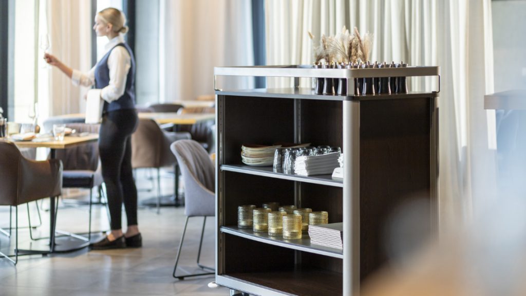 Die robuste Bauweise des Trolleys gewährleistet Langlebigkeit und Zuverlässigkeit im täglichen Einsatz. Das modulare Design ermöglicht die individuelle Anpassung an spezifische Bedürfnisse. Das macht den Mundus zum flexiblen Allrounder, der sich sowohl im Spa und Restaurant als auch im Konferenzbereich oder auf der Terrasse vielfältig einsetzen lässt. Dank zahlreicher Designvarianten, darunter die Dekore „Anthrazit“, „Eiche natur“ und „Ebony“ für den Korpus sowie den Gestellfarben „Schwarz metallic“, „Titangrau“ und „Gold metallic“, fügt er sich nahtlos in jedes Einrichtungskonzept ein. Aus dem bewährten Mundus-Konzept bietet Wanzl einen Wagen, der den Minibar-Service mühelos gestaltet. Er bietet alle Ausstattungsmerkmale für den Transport von Flaschen und Snacks, wie beispielsweise einlegbare Etagen, praktische Fachteiler, eine Reling als Abrutschsicherung sowie ein abschließbares Kunststoffrollo.