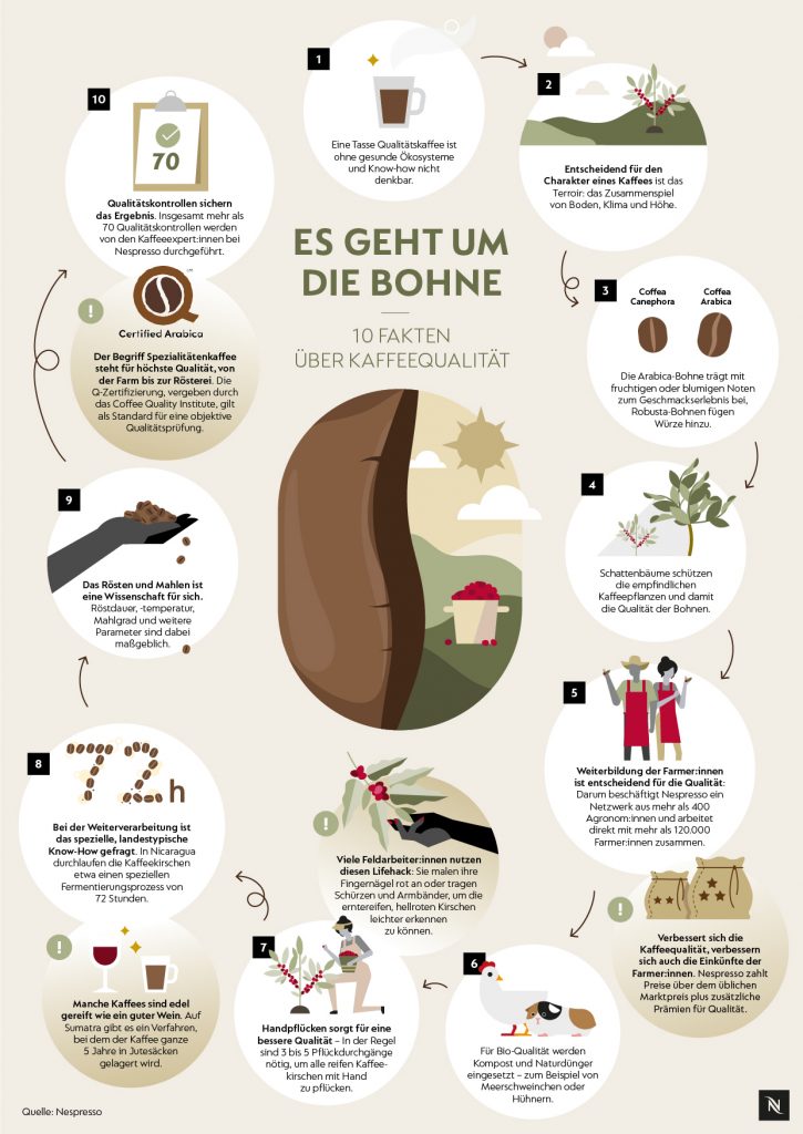 Was Nagellack mit der Kaffeeernte zu tun hat? Kaffeeernte ist Handarbeit und die Farbe der Nägel ein Trick: Viele Feldarbeiter:innen malen ihre Fingernägel rot an, um die Farbe einer reifen Kaffeekirsche immer vor Augen zu haben. Das ist wichtig, denn schon wenige unreife Bohnen können den Geschmack des Kaffees beeinträchtigen. Übrigens verbessern sich auch die Einkünfte und damit die Perspektiven der Kaffeebäuer:innen, wenn die Qualität steigt. Nespresso etwa zahlt Preise über dem üblichen Marktpreis plus zusätzliche Prämien für Qualität.