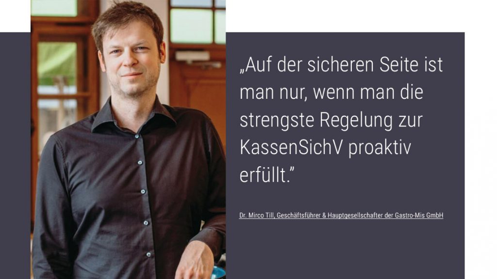 Dr. Mirco Till ist seit 10 Jahren Geschäftsführer & Hauptgesellschafter der Gastro-MIS GmbH und vorrangig für die Software-Entwicklung, TSEs digitaler Kassen sowie die nachhaltige Unternehmensstrategie zuständig. Der anerkannte Experte für manipulationssichere Kassensysteme ist Mitglied der ersten Stunde des Deutschen Fachverbandes für Kassen- und Abrechnungssystemtechnik (DFKA), seit 2016 Mitglied der Arbeitsgruppe Taxomonie sowie seit 2019 Mitglied dessen Expertenrates.