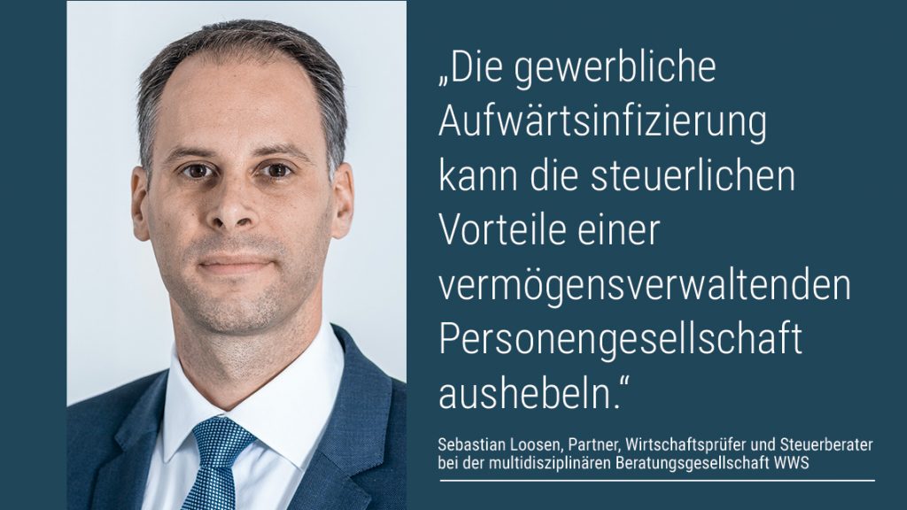 Sebastian Loosen kommentiert: „Einkünfte einer Personengesellschaft aus Vermietung und Verpachtung oder Kapitalvermögen aufgrund zusätzlicher gewerblicher Beteiligungseinkünfte bei der Einkommensteuer werden folglich in gewerbliche Einkünfte umqualifiziert. Damit verlieren sie den Status der privaten Vermögensverwaltung.“ Das Stichwort ist die „gewerbliche Aufwärtsinfizierung“: Sobald eine Untergesellschaft, also die Beteiligung, auch nur geringfügig gewerblich tätig ist, bezieht die vermögensverwaltende Personengesellschaft als sogenannte Obergesellschaft automatisch und uneingeschränkt gewerbliche Einkünfte und verliert dadurch ihren Status als nicht-gewerbliche Gesellschaftsform – auch wenn die vermögensverwaltende Personengesellschaft selbst keine gewerblichen Tätigkeiten erbringt.