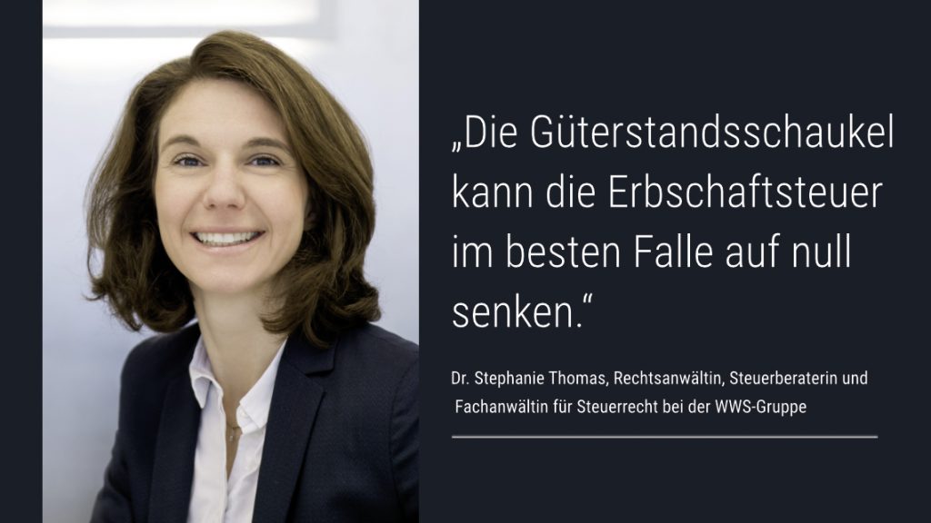 Die WWS-Partnerin hebt in diesem Zusammenhang vor allem das Instrument der sogenannten Güterstandsschaukel hervor. Darunter werden bewusste lebzeitige Änderungen des Ehegüterstands zur Erreichung eines bestimmten zivil- oder steuerrechtlichen Gestaltungsziels verstanden. Durch den gewollten Wechsel vom Ausgangsgüterstand des gesetzlichen Güterstands der Zugewinngemeinschaft in den Güterstand der Gütertrennung soll ein steuerfreier Vermögenstransfer auf den weniger vermögenden Ehegatten erreicht werden. Der Hintergrund: „Wird der Güterstand der Zugewinngemeinschaft beendet, ist der während der Ehe erzielte Zugewinn in Geld auszugleichen. Dieser Ausgleich ist vollständig schenkungsteuerfrei. Die Ehepartner wechseln durch notariellen Vertrag vom ehelichen Güterstand der Zugewinngemeinschaft in die Gütertrennung und schaukeln dann gegebenenfalls später von der Gütertrennung wieder in die Zugewinngemeinschaft zurück. Das löst den Zugewinnausgleichsanspruch aus, sodass Vermögen an den Ehegatten übergeht“, sagt Dr. Stephanie Thomas.