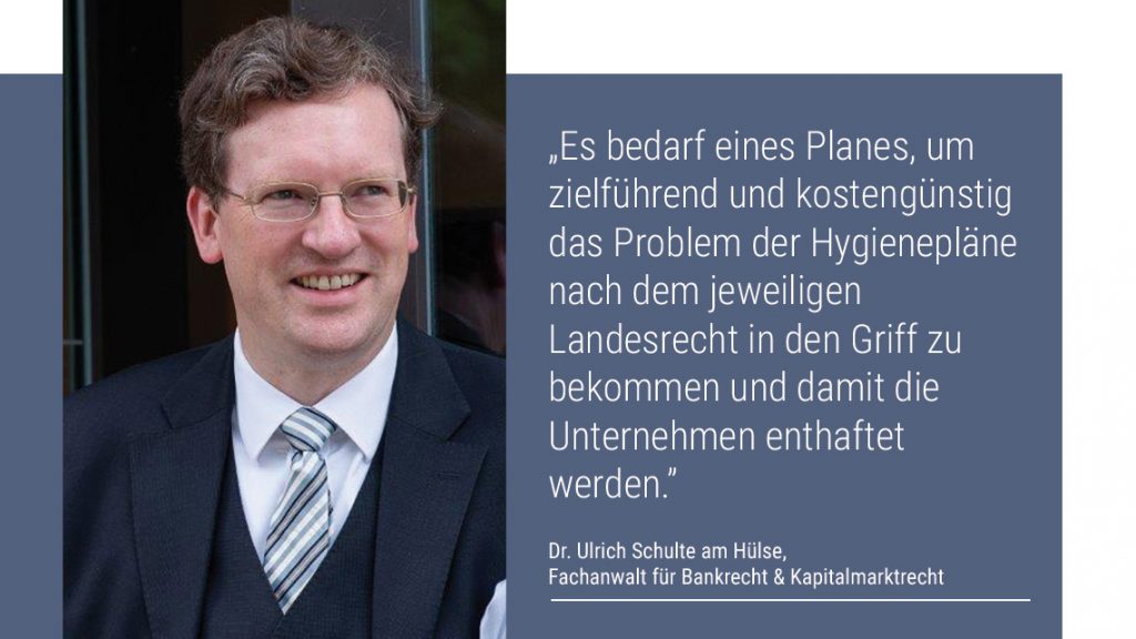 Die von Hoteliers und Gastronomen gesetzlich abverlangten Hygiene- beziehungsweise Schutzkonzepte hatten es von Anfang an in sich. Denn die in den Hygienekonzepten zu beachtenden landesrechtlichen Vollzugsvorschriften haben sich seit März 2020 nahezu permanent verändert. Worin liegt die Herausforderung bei der Aufstellung von Hygienekonzepten? Und worin liegt die rechtliche Haftungsrelevanz der Thematik? Rechtsanwalt Dr. Ulrich Schulte am Hülse beantwortet diese Fragen im Überblick.