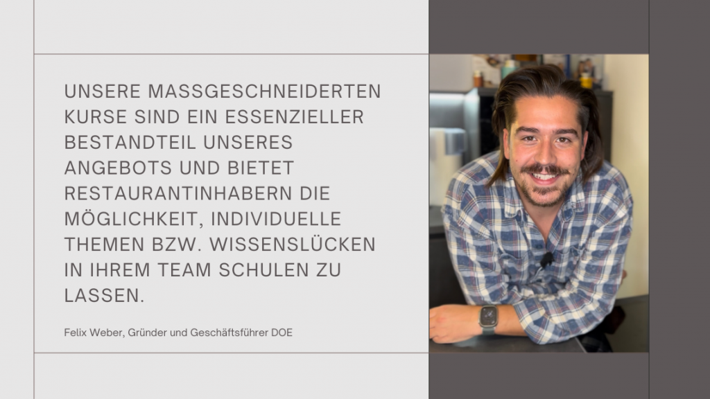Die DOE (Digital Online Education GmbH) stellt sich den einzigartigen Herausforderungen des Gastgewerbes und unterstützt aktiv den Wandel in der Branche. Mehr über den Innovationsansatz des Unternehmens und Gründer Felix Weber, dessen langjährige Vertriebserfahrung und Leidenschaft für Bildung die Grundlage für ein Konzept bilden, das darauf abzielt, das Gastgewerbe in einer sich ständig verändernden Branche zu stärken.