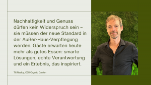 Die Außer-Haus-Verpflegung befindet sich im Wandel: Nachhaltigkeit, Digitalisierung und ein wachsendes Gesundheitsbewusstsein verändern die Erwartungen von Gästen und Institutionen grundlegend. Gefragt sind Lösungen, die Genuss, Verantwortung und Effizienz miteinander verbinden. Wie das Münchner Start-up Organic Garden diesen neuen Anforderungen begegnet und dabei Maßstäbe setzt, zeigt Till Neatby, CEO von Organic Garden.