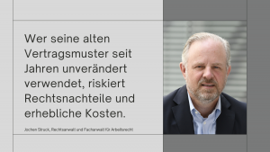 Neben dem Gesetz und den Tarifverträgen bildet der Arbeitsvertrag das rechtliche Fundament eines Arbeitsverhältnisses. Meist wird der Vertragstext vom Arbeitgeber erstellt, der diesen Vorteil nicht durch unbedachte Formulierungen aus der Hand geben sollte. Auf welche inhaltliche Anforderungen besonders geachtet werden muss, erklärt Jochen Struck, Rechtsanwalt und Fachanwalt für Arbeitsrecht.