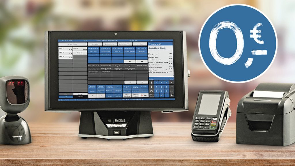 Duratec digital world bietet ein Kassensystem, bei dem alle Hardware Komponenten, die Einrichtung, Service und Support kostenlos sind. Das Angebot beinhaltet ein Duratec-Kassensystem mit 14“ Touchscreen. Auch Enthalten sind Scanner, Drucker und Bezahlterminal.