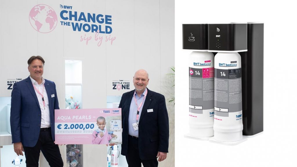 Change the World – Sip by Sip: Wie BWT water+more Nachhaltigkeit lebt, erfuhren die Besucher in der Bottle Free Zone des Messestandes. Sie testeten bestes, mit Magnesium mineralisiertes Wasser und lernten so den Unterschied zu nicht aufbereitetem Wasser schmecken. Im Gegenzug sammelte das Messeteam die Pfand-Plastikflaschen seiner Gäste ein und stattete sie dafür mit den langlebigen, wiederverwendbaren BWT-Wasserflaschen aus. Die Summe aus dem eingelösten Pfand rundete BWT water+more großzügig auf, sodass Dr. Frank Neuhausen und Michael Hübner insgesamt 2.000 Euro an die AQUA Pearls For You And Planet Blue-Stiftung übergeben konnten. Die gemeinnützige BWT-Stiftung fördert nachhaltige Projekte, insbesondere um Menschen weltweit den Zugang zu sauberem Trinkwasser zu ermöglichen.