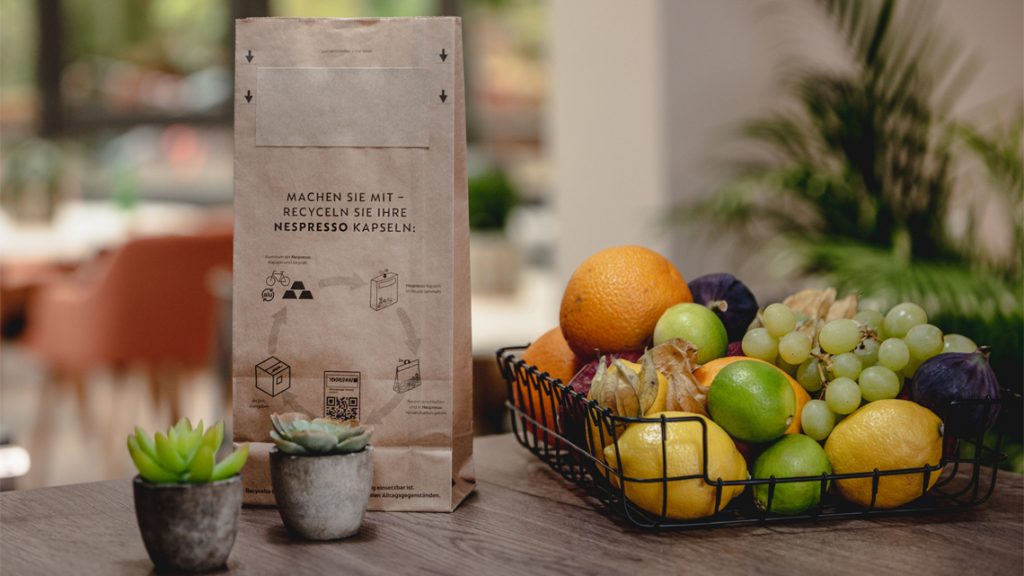 Und so geht’s: Bei Bedarf bekommen Geschäftskunden mit der nächsten Kaffeelieferung eine Recycling-Bag aus leicht foliertem Altpapier zugsendet. Hier landen die benutzten Aluminiumkapseln samt Kaffeesatz, die dann von der Deutschen Post abgeholt werden. Für die Abholung ist Nespresso Professional extra eine Kooperation mit DHL GoGreen eingegangen. Eine bewusste Entscheidung, denn der Paketdienst fährt emissionsfrei. „Unser Ziel ist es, vollständig klimaneutral zu werden. Dafür sind wir auch in der Lieferkette und der Entsorgung neue Wege gegangen“, meint Anis Hachem. Im letzten Schritt werden die Kapseln vom Paketdienst an einen Recyclinghof abgegeben und dort pyrolisiert. Das nun gewonnene Sekundäraluminium schenkt unter anderem Fahrrädern, Autos und Kugelschreibern neues Leben.