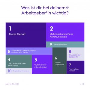 Manche Dinge ändern sich wohl nie – zumindest nicht so schnell: Noch immer wünschen sich junge Arbeitnehmer*innen Ehrlichkeit sowie Offenheit in der Kommunikation, für Ideen und Konzepte von ihren Arbeitgeber*innen und legen Wert darauf, dass Unternehmen ihnen die Möglichkeit zur individuellen und professionellen Weiterbildung geben. Zudem schätzen sie gute Karrieremöglichkeiten innerhalb des Betriebes. Auch soziales Engagement und nachhaltiges Handeln wird nach wie vor gern gesehen. Das wichtigste ist ihnen jedoch in diesem Jahr ein gutes Gehalt (2021 auf Platz 2) – jedoch nicht um jeden Preis, nur 30% ist das Einkommen wichtiger als ihre Freizeit. Eher weniger wichtig sind Diversität am Arbeitsplatz, flache Hierarchien und regelmäßige Firmenfeiern. Das bedeutet jedoch nicht, dass die Gen Z außerhalb der Arbeit nichts mit ihren Kolleg*innen zu tun haben möchte: 43% verbringen auch ihre Freizeit mit ihnen.