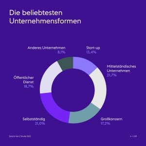 Da Arbeitsplatzsicherheit für die junge Generation ein wichtiger Aspekt bei der Wahl ihres Arbeitgebers/ihrer Arbeitgeberin ist, ist es nicht weiter verwunderlich, dass auch dieses Jahr der deutsche Mittelstand als beliebteste Unternehmensform knapp die Nase vorn hat (22%), dicht gefolgt vom öffentlichen Dienst mit 19%. Doch nicht alle favorisieren Sicherheit und geordnete Bahnen – viele wollen wie bereits erwähnt ihren Arbeitsalltag selbstbestimmt und flexibel gestalten: Den Weg in die Selbstständigkeit können sich 21% vorstellen. Großkonzerne sind für 17% der jungen Arbeitnehmer*innen attraktiv, während Start-ups dieses Jahr wohl aufgrund der wirtschaftsbedingten Kündigungswellen und Sparmaßnahmen deutlich an Attraktivität einbüßen (13%; knapp 10% weniger als im Vorjahr). Ein ganz ähnliches Bild zeichnet sich in Großbritannien und den Niederlanden ab. Auch hier trumpfen Mittelstand und Selbstständigkeit auf (33% bzw. 31% sowie 20% bzw. 23%), während die jungen Arbeitnehmer*innen in England nach mittelständischen Unternehmen Großkonzerne (24%) als attraktivste Unternehmensform sehen. Anders als in Deutschland ist der öffentliche Dienst in beiden Ländern weit abgeschlagen – nicht einmal 10% der Gen Z interessiert sich in Großbritannien und den Niederlanden für den Staatsdienst.
