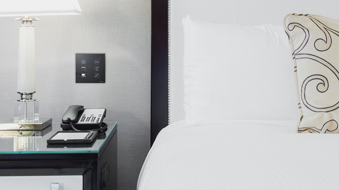 Nicht nur im Hinblick auf die Beleuchtung birgt ein smartes System enormes Einsparpotenzial. Eine moderne und flexible Raumautomation sorgt für gesunde und nutzerspezifische Umgebungsbedingungen und wirkt sich als Teil der Gebäudeautomation auch auf die gesamte Energieeffizienz aus. Alternativ zu konventionellen Schalterprogrammen bietet Miditec beispielsweise individuell parametrierbare Bedienelemente wie das Bedside-Panel oder das Klimamodul, über die Gäste verschiedene Bereiche wie Beleuchtung, Temperatur oder auch Jalousien in ihrem Hotelzimmer separat steuern können. Dies vereinfacht die Bedienbarkeit für Nutzer und führt zugleich zu einer deutlichen Verbesserung der Energieeffizienz. In Kombination mit RFID-Chip-basierten Personal- oder Gästeausweisen lassen sich zuletzt genutzte Einstellungen abspeichern und sogar individuelle Raumprofile einzelner Personen hinterlegen, die dann beim Betreten des Zimmers über die Card-Schalter aktiviert werden. Optional ist dabei auch eine Steuerung der Raumautomation über Smartphone oder Tablet möglich.