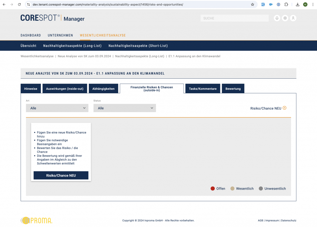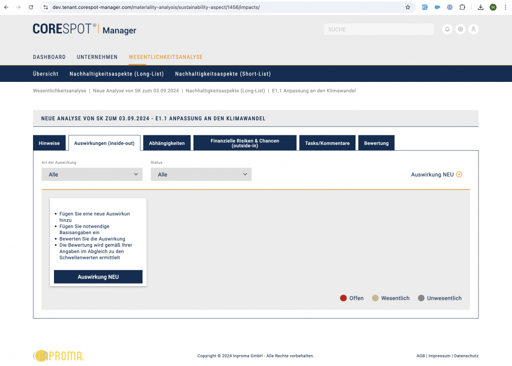 Mit einer Software-Lösung, wie beispielsweise dem Core Spot® Manager, lässt sich die doppelte Wesentlichkeitsanalyse inklusive der Wesentlichkeits-Matrix exakt abbilden. Die tüv-zertifizierten Experten von Core Spot® bieten Beratungstermine zur Software-Vorstellung an, die hier direkt gebucht werden können.