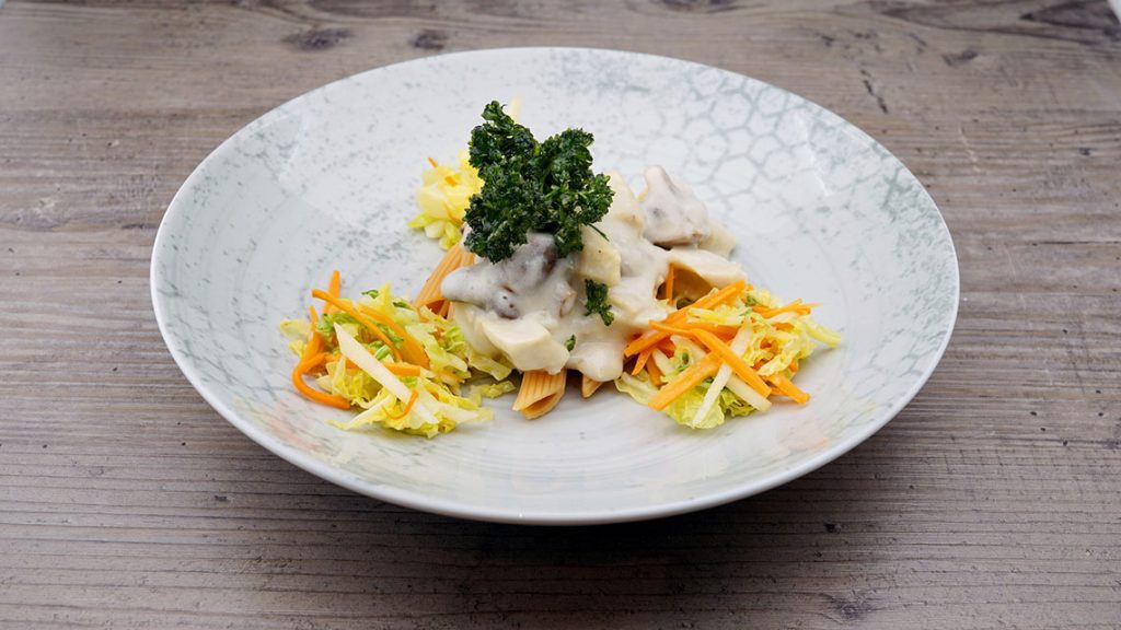 Vegane Filetstreifen „Züricher Art“ mit Karotte-Apfel und Vollkornpasta