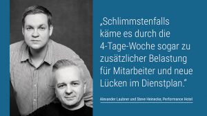 Vielen Hotels scheint es, als seien sie seit Jahren in einem Teufelskreis gefangen: Da es an Fachkräften mangelt, muss das verbleibende Personal mehr arbeiten. Hält dieser Zustand der Überlastung an, gehen mehr Mitarbeiter verloren – ein Ausweg ist nicht in Sicht. Entsprechend groß ist der Druck, schnelle und effektive Lösungen zu finden. Steve Heinecke von der Performance Hotel GmbH zur 4-Tage-Woche und alternativen Strategien.