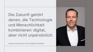 Ob im Hotelbetrieb, für Buchungen oder beim Feedback – Digitalisierung und KI sind aus der modernen Hotellerie nicht mehr wegzudenken. Sie hilft Unternehmen vielerorts, Prozesse zu vereinfachen und Kosten zu reduzieren. Andreas von Reitzenstein, COO der LÉGÈRE HOTELGROUP, ist Experte für Digitaliserung und setzt auf verschiedene smarte Tools für einen effizienten Hotelbetrieb.