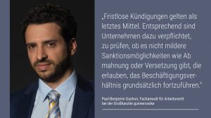 Jobverlust, Sperrzeit beim Arbeitslosengeld und Probleme bei künftigen Bewerbungen? Eine fristlose Kündigung hat für betroffene Beschäftigte oft massive Folgen. Kein Wunder, dass der Gesetzgeber hohe Hürden setzt, damit eine solche außerordentliche Beendigung des Arbeitsverhältnisses rechtlich Gültigkeit besitzt. Paul-Benjamin Gashon, Fachanwalt für Arbeitsrecht bei der Großkanzlei gunnercooke, verrät, was das konkret bedeutet.