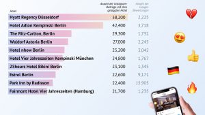Das Immobilienvermittlungsunternehmen Tranio hat auf Grundlage der Anzahl von Google-Bewertungen und Instagram-Aktivitäten der Nutzer ein Ranking von Hotels in Deutschland erstellt*. Die Datenanalyse ermittelte aus 13.000 deutschen Gastgewerbebetrieben auf Google Maps die zehn Hotels, die am häufigsten in einem Instagram-Feed erscheinen.