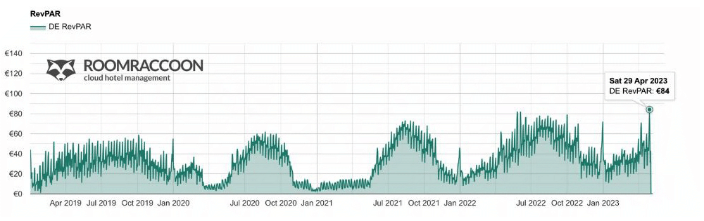 Der Umsatz je verfügbarem Zimmer (Revenue Per Available Room bzw. RevPAR), eine der Standardkennzahlen für den wirtschaftlichen Erfolg von Unterkünften, lag von Anfang Januar bis Ende April bei durchschnittlich 35€. Dies sind 35% mehr als im Vorjahreszeitraum. Für das lange Wochenende mit dem Tag der Arbeit steht sogar ein Top-RevPAR von 84€ (am 29. April) zu Buche. Dies ist der höchste Wert, den die Hotelmanagement-Software von RoomRaccoon seit ihrem Schritt auf den deutschsprachigen Markt im Januar 2017 bislang verzeichnet hat.
